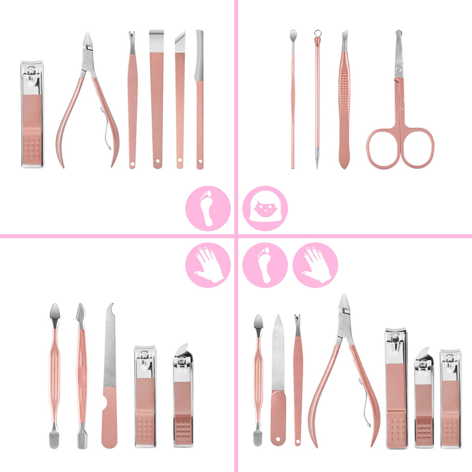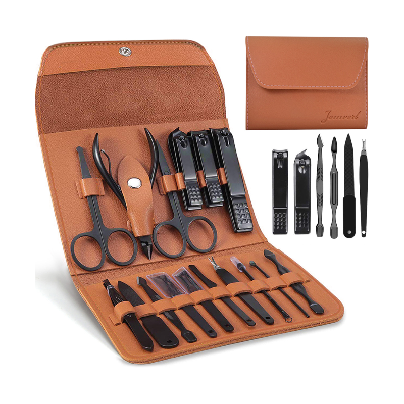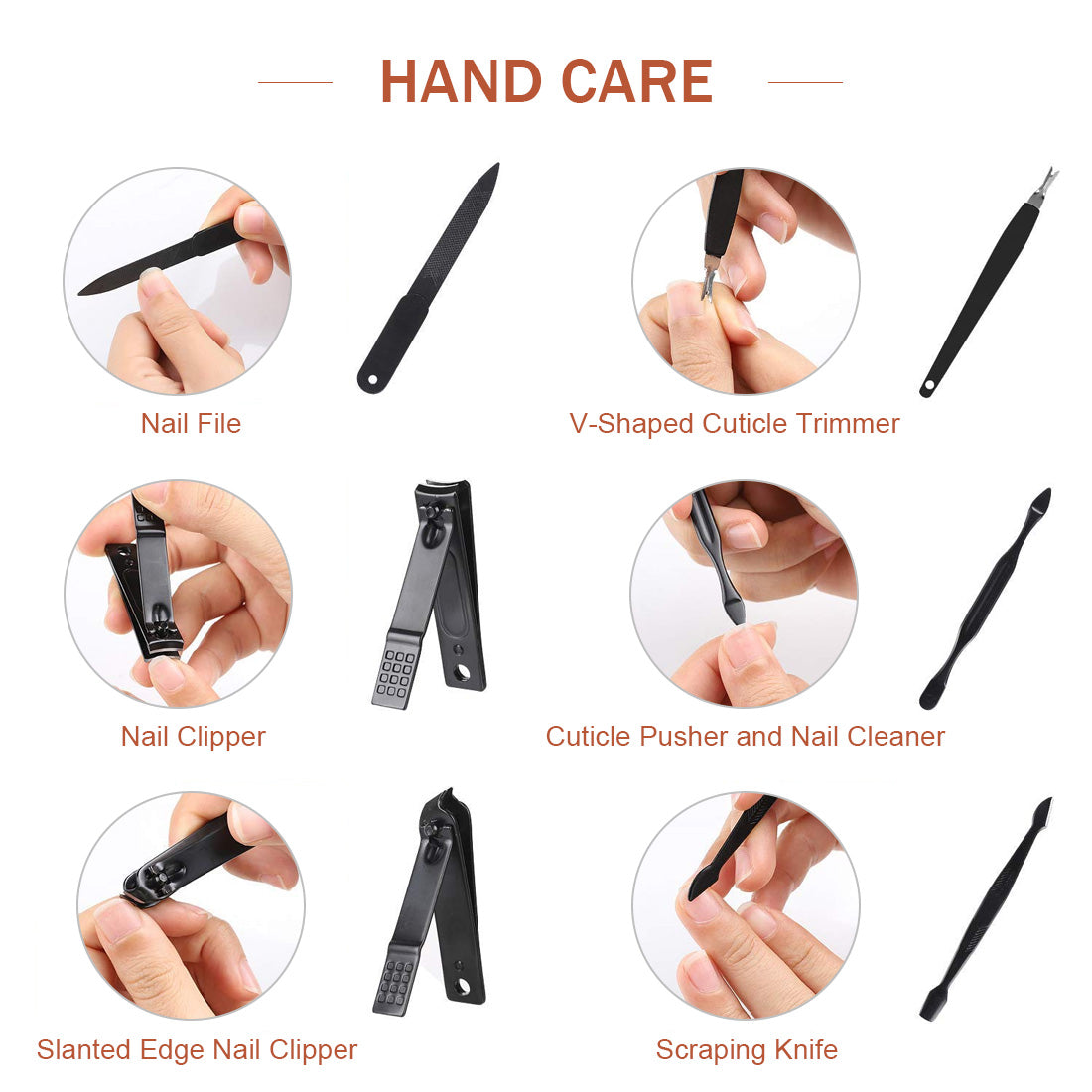 This Professional Manicure Set Contains 16 pieces facial, nail and toenail tools for hand care,facial care,foot care: Nail clippers Set, Cuticle Nipper, Pedicure Knives,cuticle pusher cleaner, nail gel remover,nail file, v-shaped cuticle trimmers, eyebrow shaping tweezers, multi-purpose scissor, blackhead needle with loop remover ear pick and cleaning brush