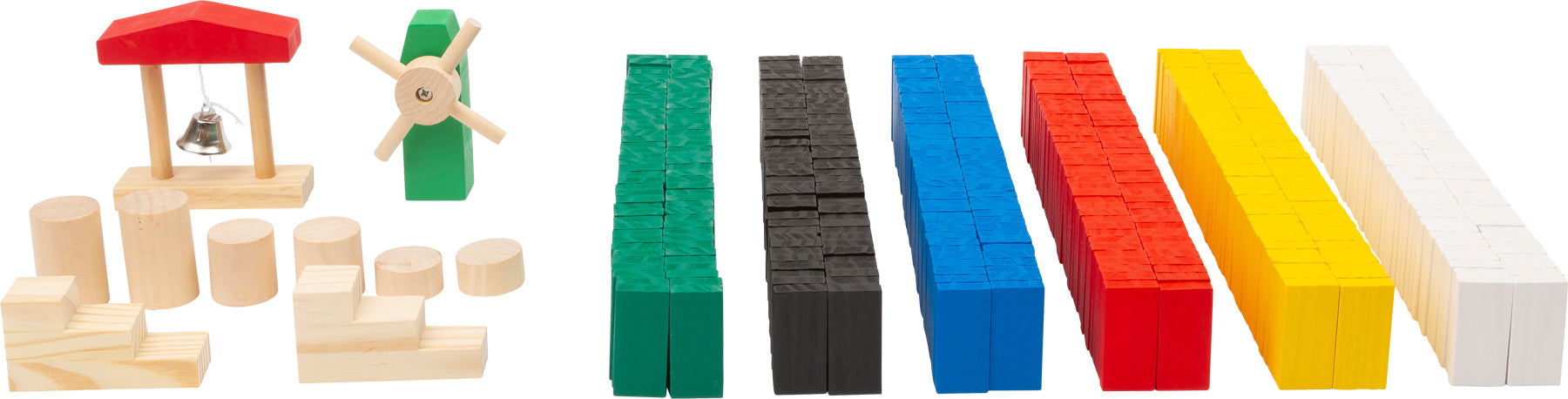 Dominospil med 490 farverige brikker med trapper, klokke og mølle til at lave flotte mønstre og kædereaktioner med.